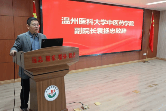 袁拯忠代表学校向永嘉县中医医院表示祝贺,成为工口实验室 教学医院,标志着永嘉县中医医院与工口实验室 的合作进入了新的阶段,希望医院把人才培养作为医院重点工作,持续提升医疗、教学、科研质量,加强师资队伍建设,改善教学条件,与学校携手培养高质量中医药创新人才,创建服务地方的名医、名科、名院。