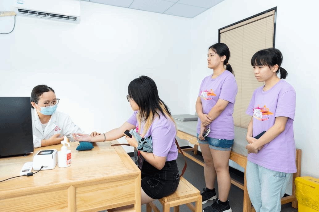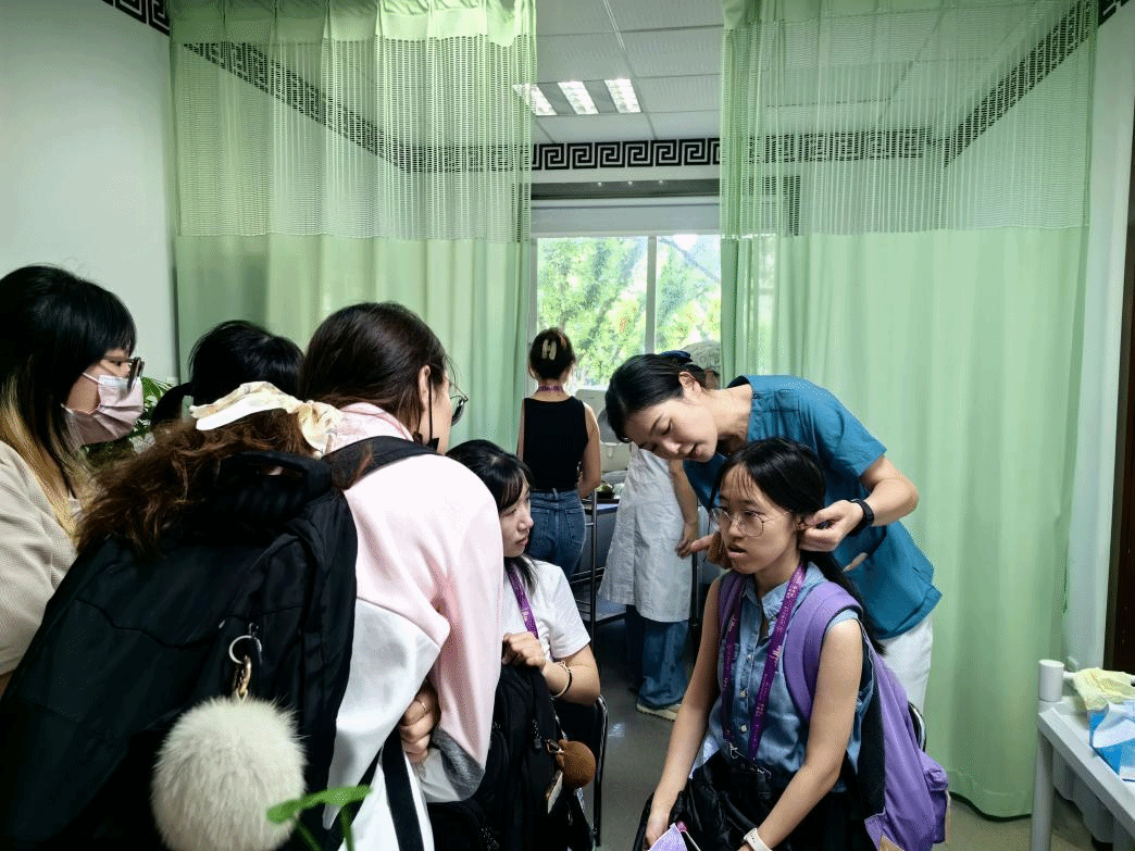 为了让同学对中医疗法有更加直观的认识,研习营前往温州市中西医结合医院参观了不同的科室,在带教老师们的介绍下,同学了解到各科的名医、中医特殊治疗方法等。“在台湾的中医馆并不是很多,刚看到老师演示了‘中医吹药’,真的是很奇妙的体验,感觉好神奇。”台生黄心瑜提到了中医和西医治疗的差异性。在瓯越名医馆,阵阵中草药特有的馨香扑面而来,品药膳、使用药戥子秤称药……延生堂的中医为大家讲解阳虚、血瘀、湿热等九大体质的生活表现,并结合个人身体状况提供一些生活习惯上的建议,还在不同的穴位为同学贴上具有独特功效的三伏贴。