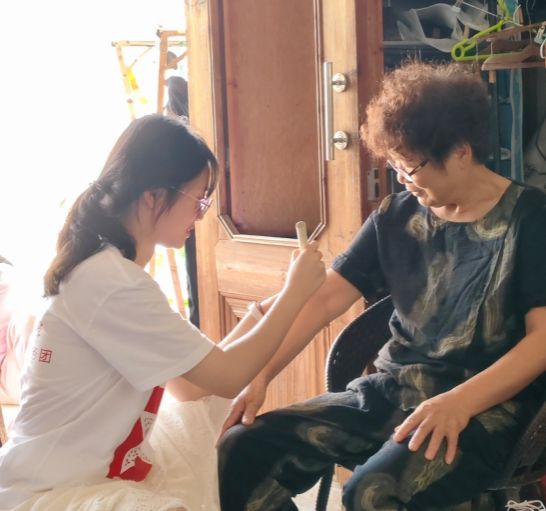 “是时三伏天,天气热如汤”,实践队员们不畏酷暑,带着艾灸条和耳穴贴,挨家挨户地走进村民家中,为他们提供艾灸与耳穴等中医理疗服务。林大娘三姐妹在接受义诊后,激动地说:“非常感谢工口实验室
